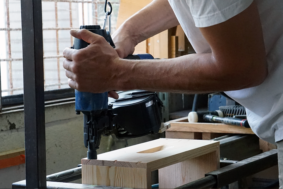 Jusqu’à présent, nos éléments de ruche étaient fabriqués avec un assemblage mi-bois agrafé. Désormais, nous passons à un assemblage mi-bois cloué, avec des pointes torsadées 50 × 2,5 mm sur les 4 faces.