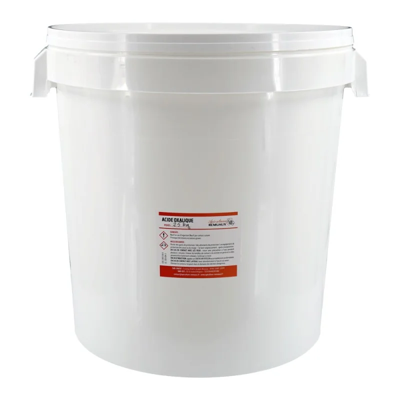 L’acide oxalique est utilisé en apiculture pour le nettoyage du bois de ruche et la préparation des surfaces avant traitement. Proposé ici en seau de 25 kg, ce conditionnement est adapté aux volumes d’utilisation importants, notamment pour l’entretien régulier de plusieurs ruches ou de matériel apicole.