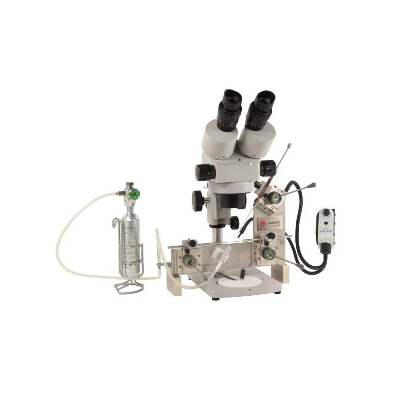 La précision est assurée : pendant que vous travaillez avec les crochets ventraux et les crochets à dards, vos poignets reposent sur la table. Le support de la table stabilisera vos mains. Un micromanipulateur de type joystick, réduit les mouvements dans un rapport de 10:1 et actionne les crochets et la seringue. La seringue est composé d'un cylindre et d'un piston en caoutchouc, qui peut être facilement changé. Les capillaires en verre peuvent aussi être remplacés facilement. Il est aisé de démonter la seringue pour la stériliser et elle peut être insérée dans son embase par devant. Le support de la reine est d'un montage simple. Le CO² arrive au travers d'une valve qui dans le même temps peut être poussé vers le haut pour maintenir la reine en position.