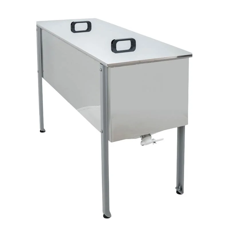 La structure en acier inoxydable garantit une excellente résistance à la corrosion et à l’humidité. Ce bac est conçu pour supporter les contraintes d’une utilisation régulière en miellerie.