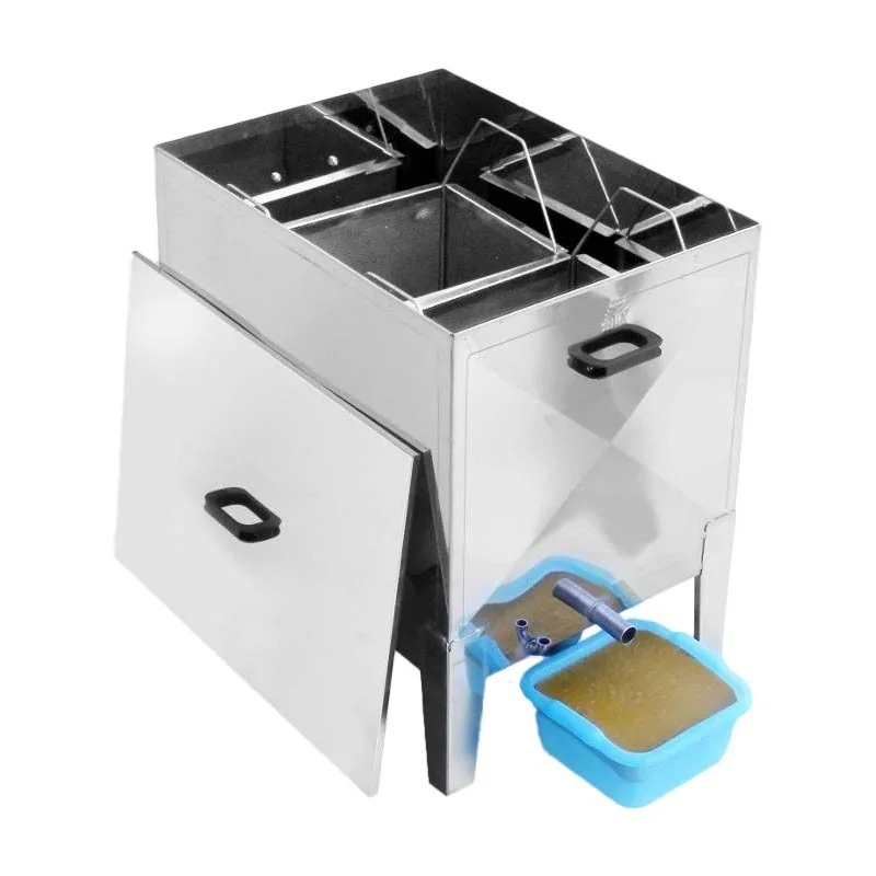 Grâce à la vapeur produite par l’eau portée à ébullition, la cire fond progressivement et s’écoule naturellement dans le bac de récupération fourni, tandis que les cadres restent intacts.