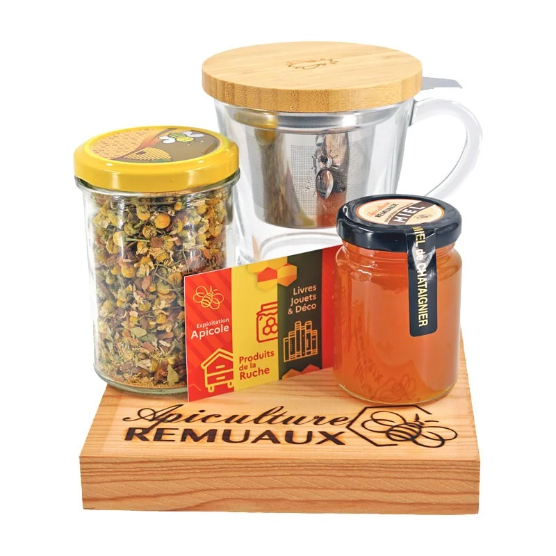 Ce coffret tisanière rassemble trois éléments complémentaires : une tisanière en verre La Rochère avec couvercle en bambou, un pot de miel de châtaignier bio récolté par nos soins, et une infusion bio “Tisane Mielleuse” en vrac. Présentés sur une planche en bois estampillée Apiculture Remuaux, ces produits allient bien-être, qualité et élégance.