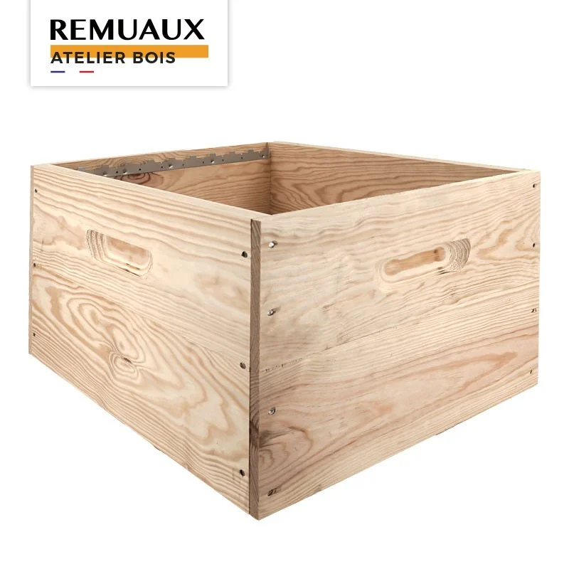 Le corps Dadant mi-bois 10 cadres avec crémaillères est conçu pour accueillir 10 cadres Dadant droits. Fabriqué dans notre atelier de menuiserie dans le Tarn, il est réalisé en pin maritime français et assemblé en mi-bois cloué et collé pour une structure adaptée aux contraintes de l’apiculture.