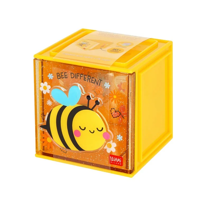 Le Cube organisateur de bureau abeille Legami "Bee Different" apporte une touche de soleil et de fantaisie à votre espace de travail. Compact, empilable et décoré d'une adorable abeille scintillante, il est idéal pour ranger vos petits accessoires de papeterie.