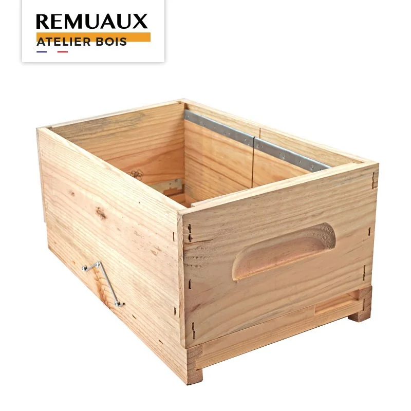 Cette haussette 2 x 6 cadrons complète est spécialement conçue pour l’élevage et la fécondation des reines. Fabriquée dans notre atelier bois Apiculture Remuaux, elle se compose d’un plateau avec deux entrées opposées, d’un corps avec séparation centrale amovible, de deux nourrisseurs et d’un toit en tôle.