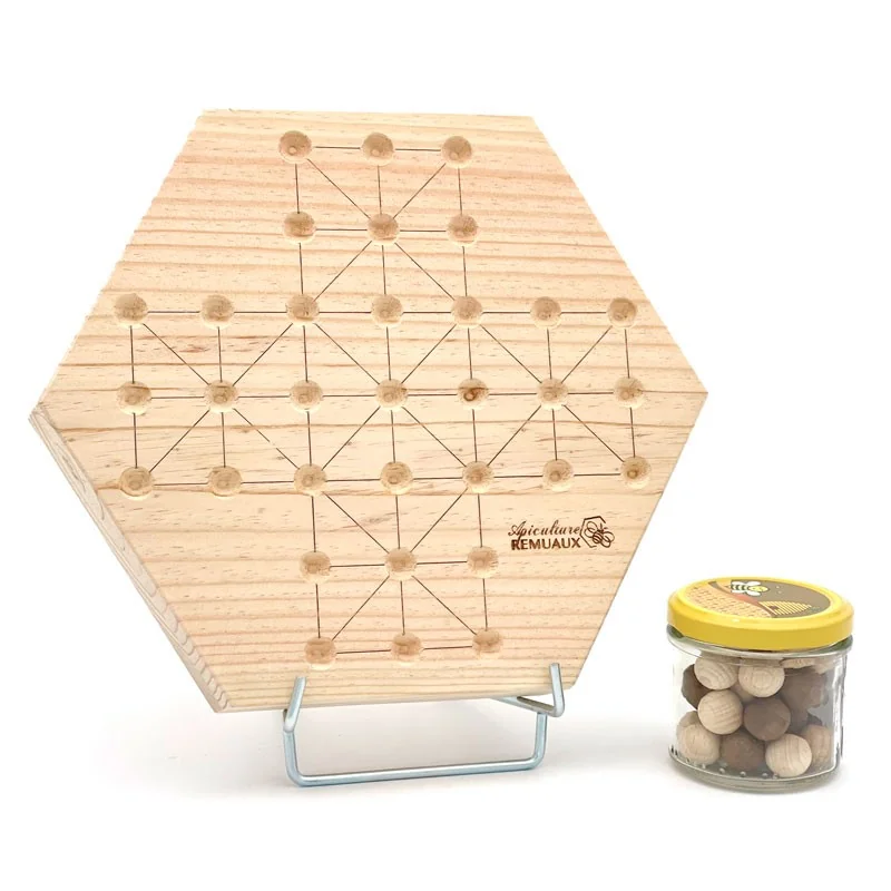 Le jeu en bois réversible Alquerque / Ours & Abeilles est un jouet éducatif et ludique qui propose deux jeux de stratégie sur un même plateau en forme d'alvéole. Fabriqué artisanalement par notre atelier bois dans le Tarn, il est livré avec 25 billes en bois dans un pot de miel.