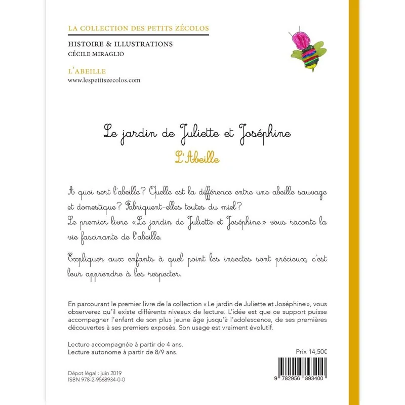 « L’Abeille » est le premier tome de la collection « Le jardin de Juliette et Joséphine » imaginée par Cécile Miraglio. À travers les yeux de deux sœurs curieuses, les enfants apprennent à observer, comprendre et respecter les insectes pollinisateurs. Juliette, la grande sœur, explique à Joséphine le monde passionnant des abeilles : leur rôle dans la ruche, la fabrication du miel, les différences entre abeilles sauvages et domestiques, et surtout leur importance pour la biodiversité.