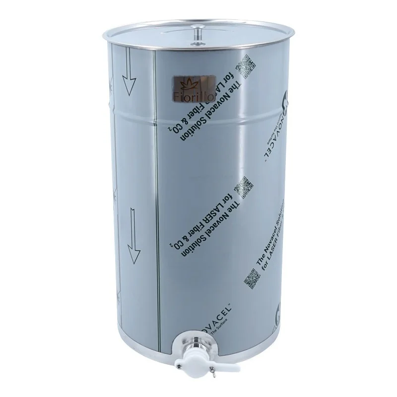 Le corps du maturateur est fabriqué en acier inoxydable, un matériau durable, facile à nettoyer et parfaitement adapté au contact alimentaire. Le robinet en plastique alimentaire permet un écoulement maîtrisé du miel lors de la mise en pot.