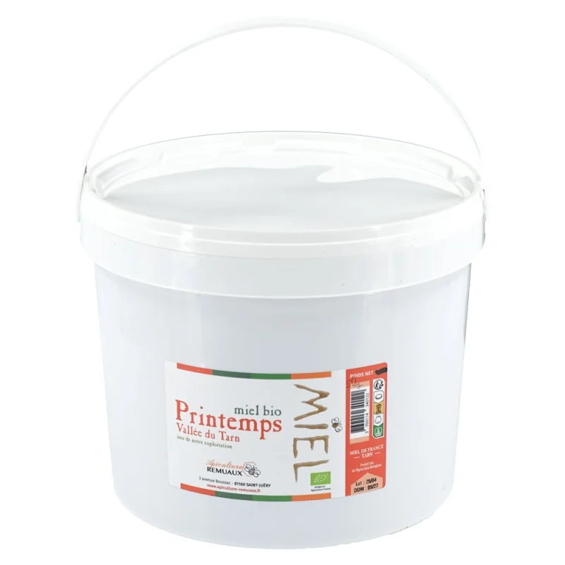 Ce miel de printemps issu de l’agriculture biologique est produit par notre exploitation située à Saint-Juéry, dans le Tarn. Les ruches sont installées au printemps dans des zones de prairies et de floraisons sauvages de la vallée du Tarn.