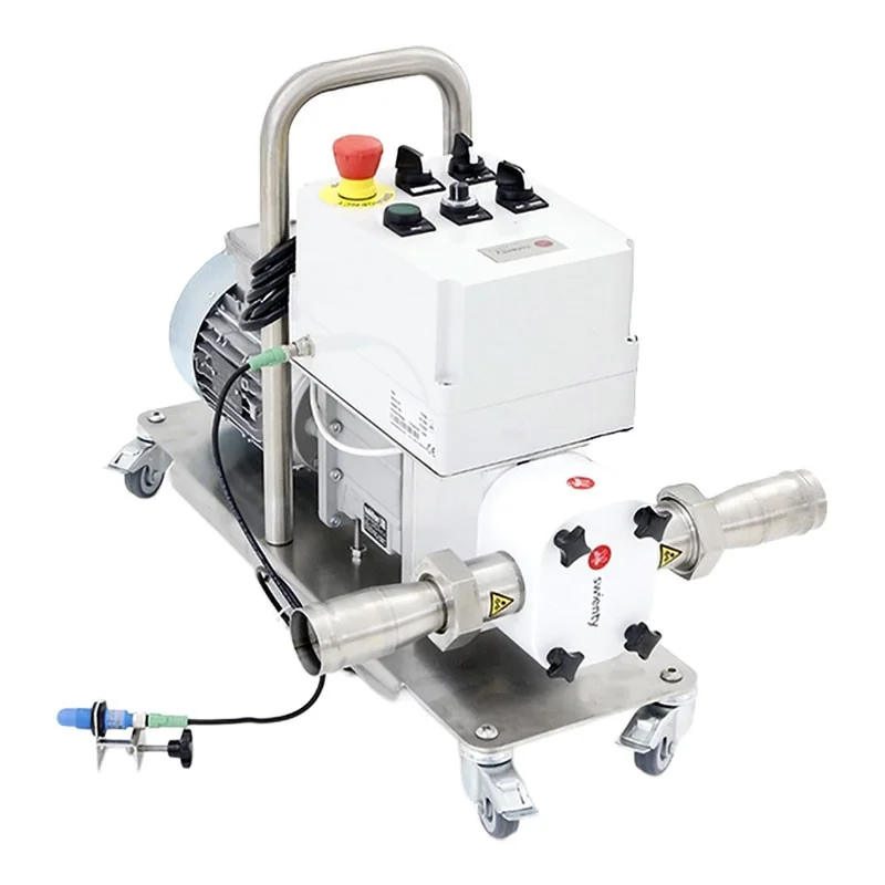 Il s’agit d’une pompe à engrenages bidirectionnelle, permettant le remplissage ou la vidange des cuves avec un seul équipement. Le corps de pompe est en plastique alimentaire robuste avec engrenages en plastique, tandis que le châssis et les raccords sont entièrement en acier inoxydable.