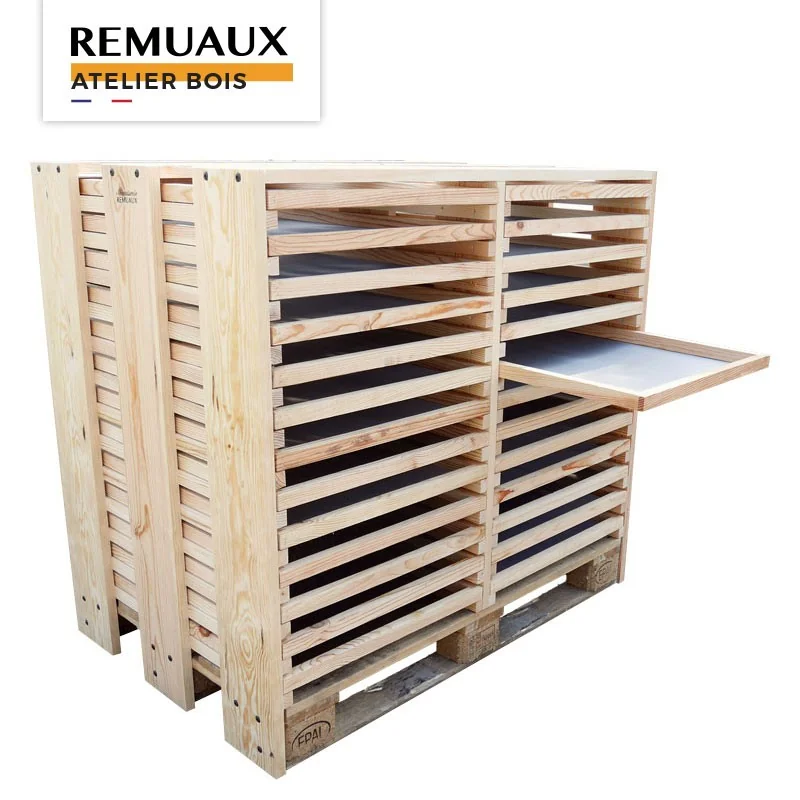 Conçu en bois français (pin des Landes) avec 26 tiroirs à fond grillagé inox, il permet un séchage naturel et homogène du pollen tout en préservant sa qualité nutritionnelle.