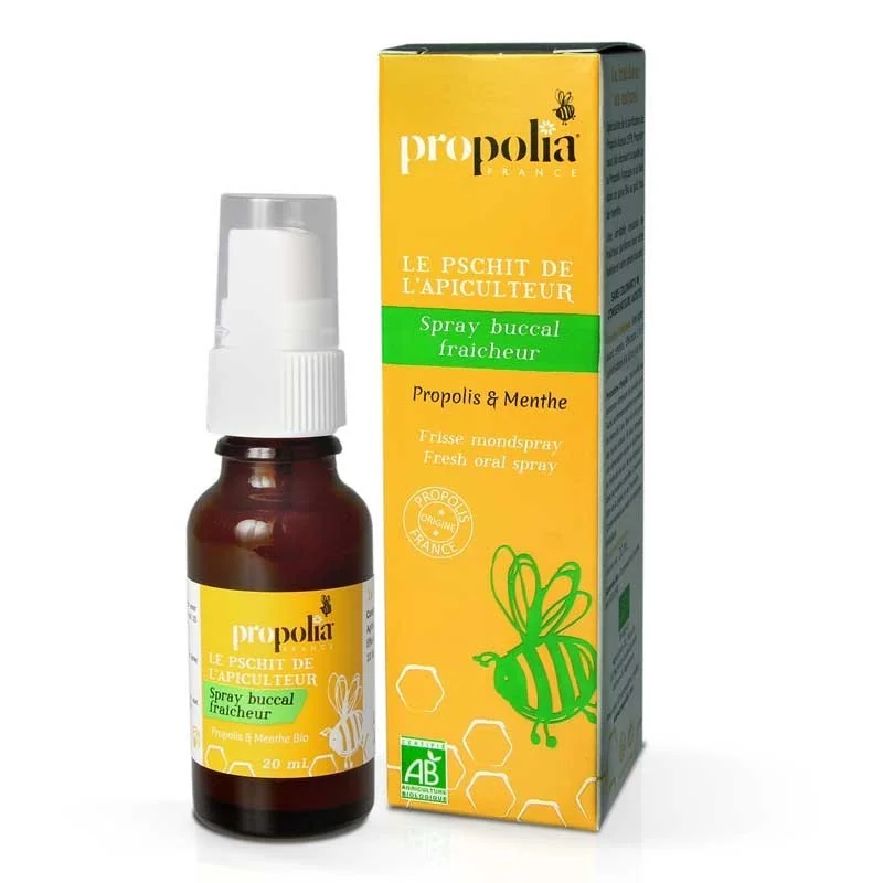 la Propolis Française et du Miel dans ce spray Bio au goût frais de menthe.